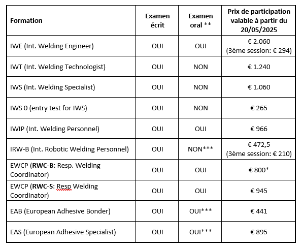 * examens écrits après chaque module (pour le 3ème examen écrit de chaque module, un coût administratif de € 105 (hors TVA) sera facturé