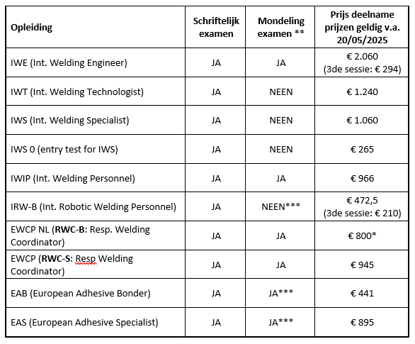 * schriftelijke examens na elke module (voor het 3de schriftelijk examen van elke module, wordt een administratieve kost aangerekend van € 105 (excl. BTW)